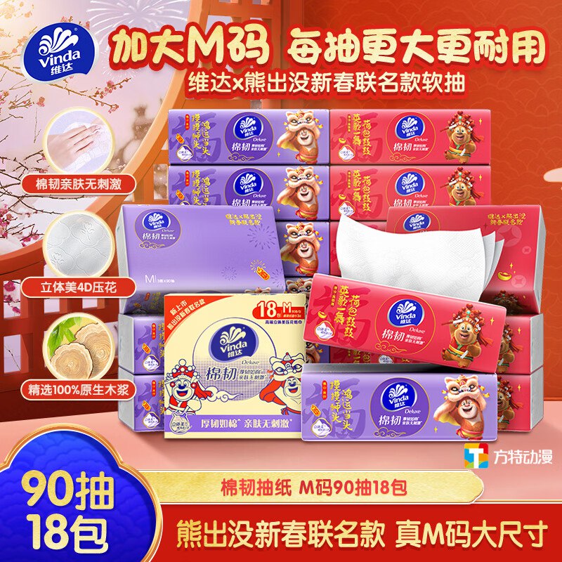 维达 抽纸 棉韧3层90抽×18包M码 熊出没联名款