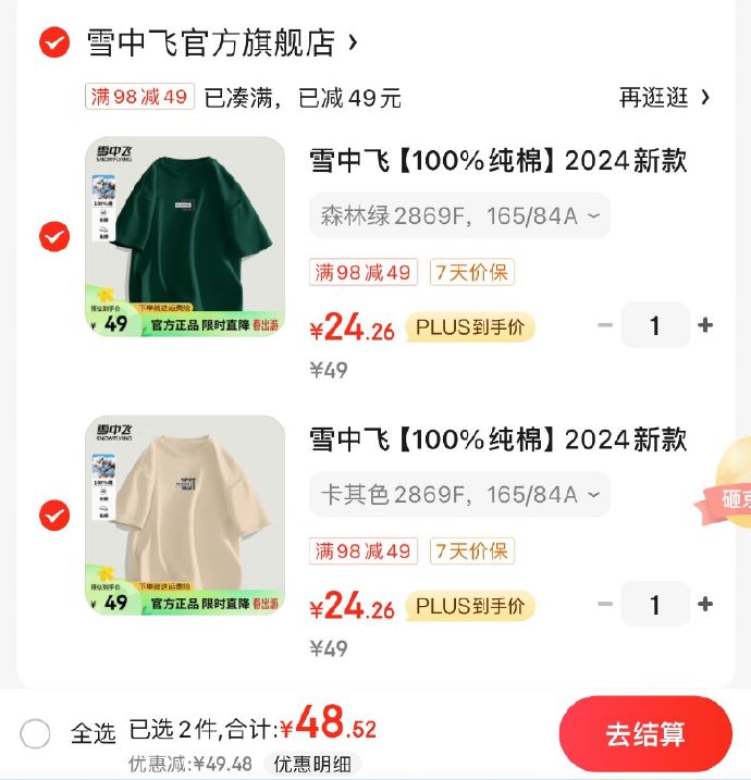 领 雪中飞100%纯棉短袖T恤 任选2件49元 折24.5/件
