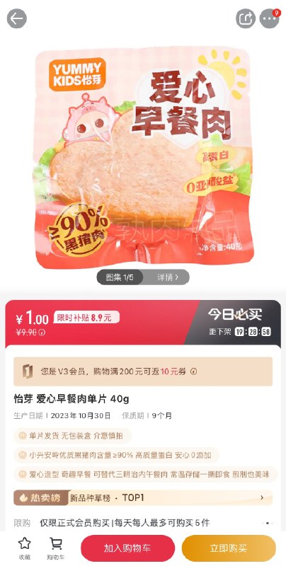 1号会员店APP 搜索“怡芽” 爱心早餐肉单片40g,1,限购5件