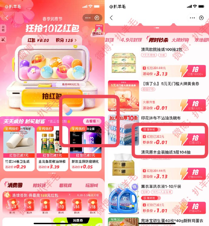 某付宝,首页春季消费节,点去看看,有0.01实物